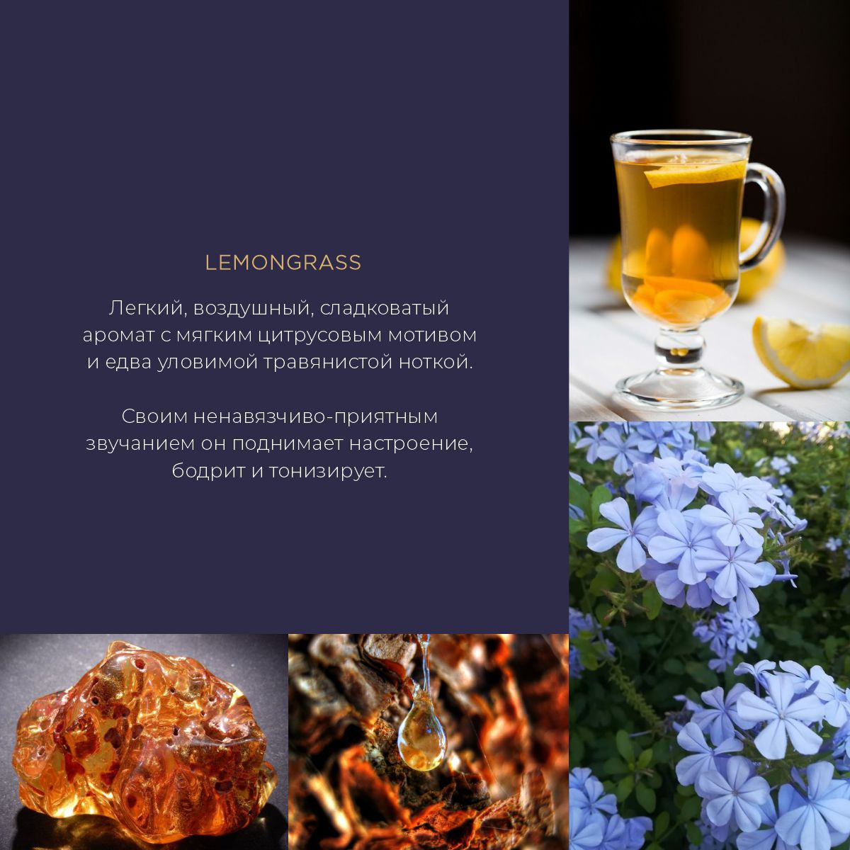 «Lemongrass» (Лемонграсс) Аромат - Легкий, воздушный, сладковатый аромат с мягким цитрусовым мотивом и едва уловимой травянистой ноткой. Своим ненавязчиво-приятным звучанием он поднимает настроение, бодрит и тонизирует.