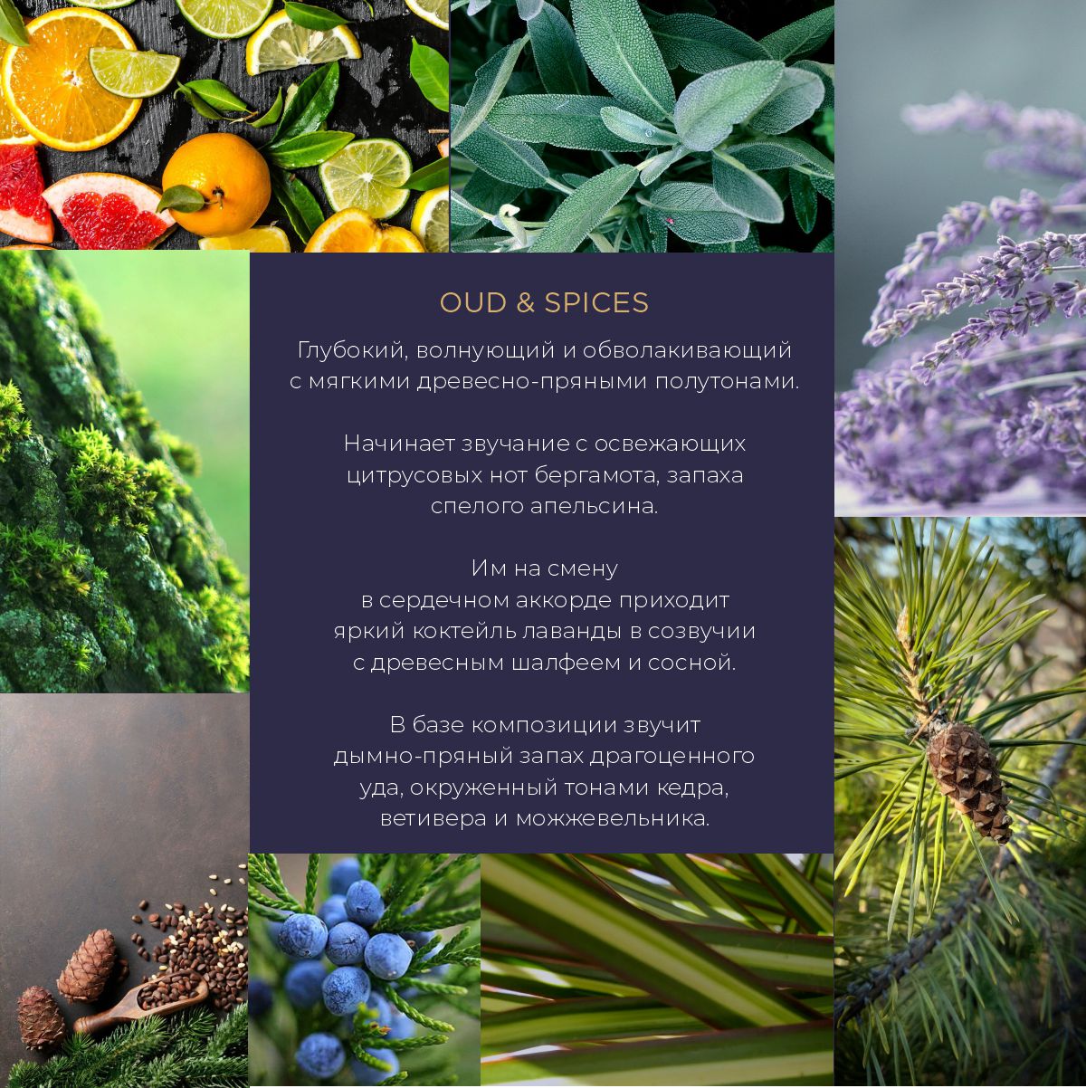 Oud & Spices (Уд и специи) Аромат - Глубокий, волнующий и обволакивающий с мягкими древесно-пряными полутонами. Начинает звучание с освежающих цитрусовых нот бергамота, запаха спелого апельсина. Им на смену в сердечном аккорде приходит яркий коктейль лаванды в созвучии с древесным шалфеем и сосной. В базе композиции звучит дымно-пряный запах драгоценного уда, окруженный тонами кедра, ветивера и можжевельника.