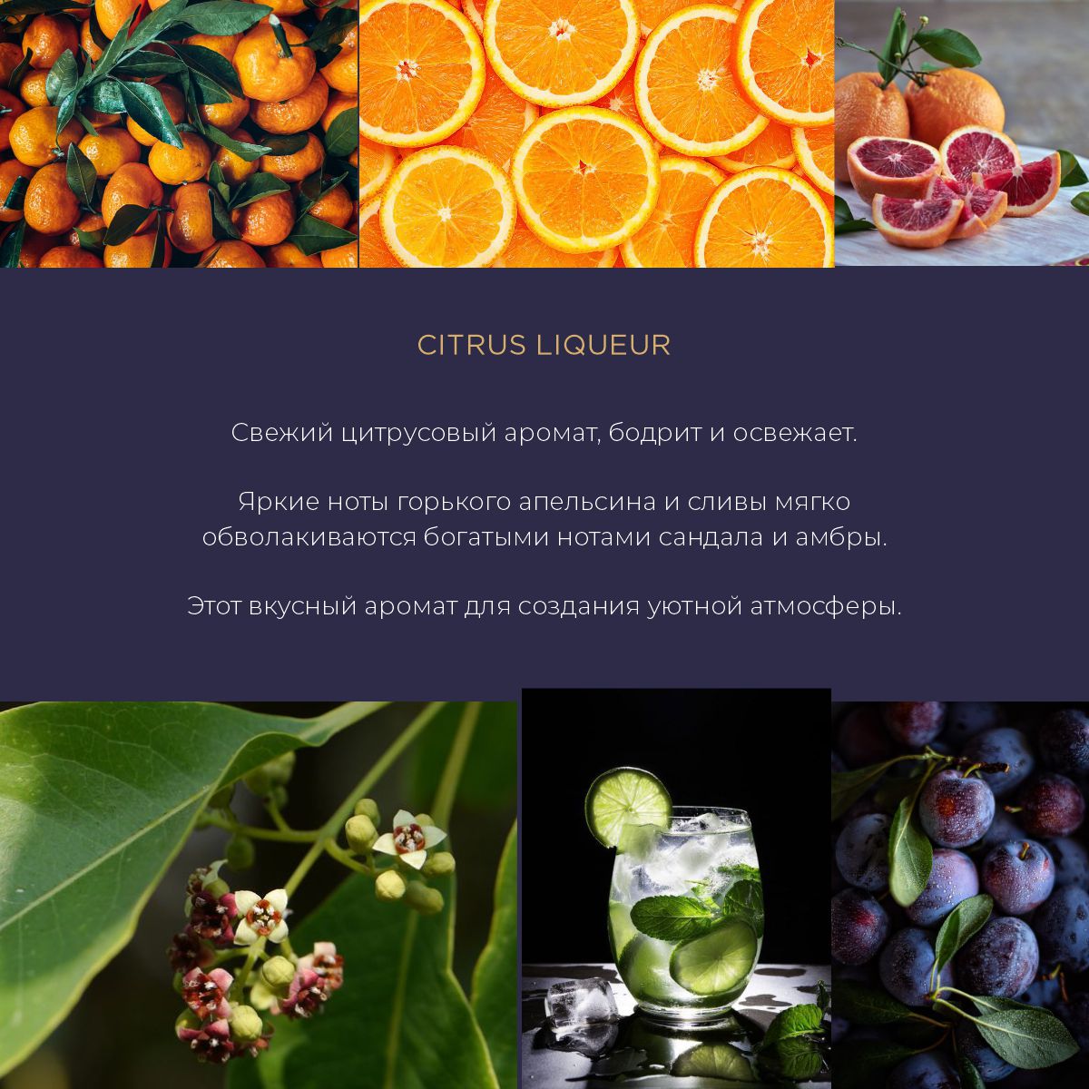 Citrus Liqueur (Цитрусовый ликер) Аромат - Свежий цитрусовый аромат, бодрит и освежает. Яркие ноты горького апельсина и сливы мягко обволакиваются богатыми нотами сандала и амбры. Этот вкусный аромат для создания уютной атмосферы.