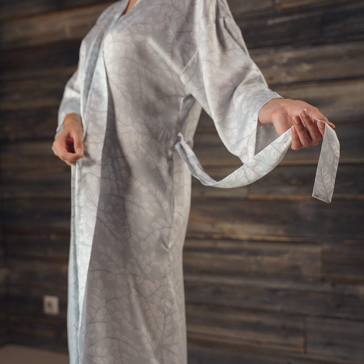 Модель: халат-кимоно, завязывается поясом на запах, имеет внутренние завязки и карманы в швах