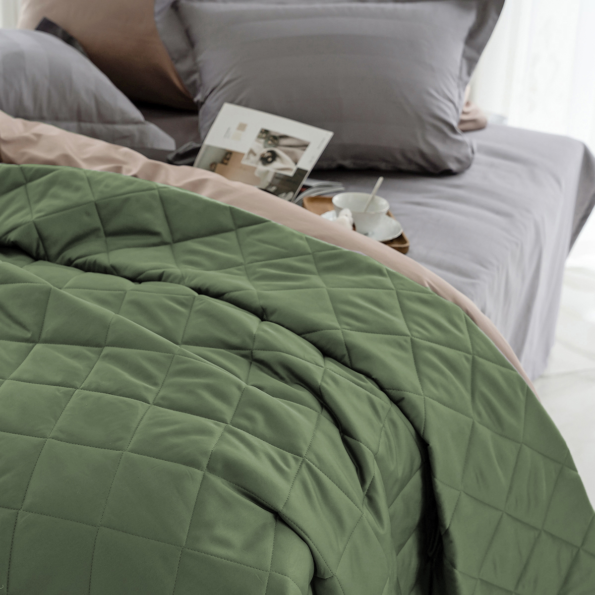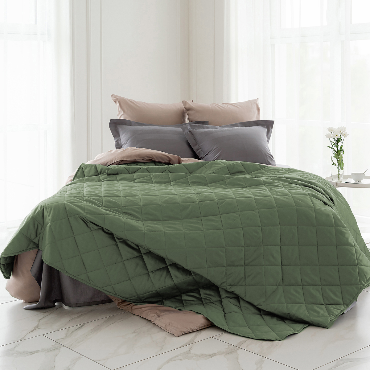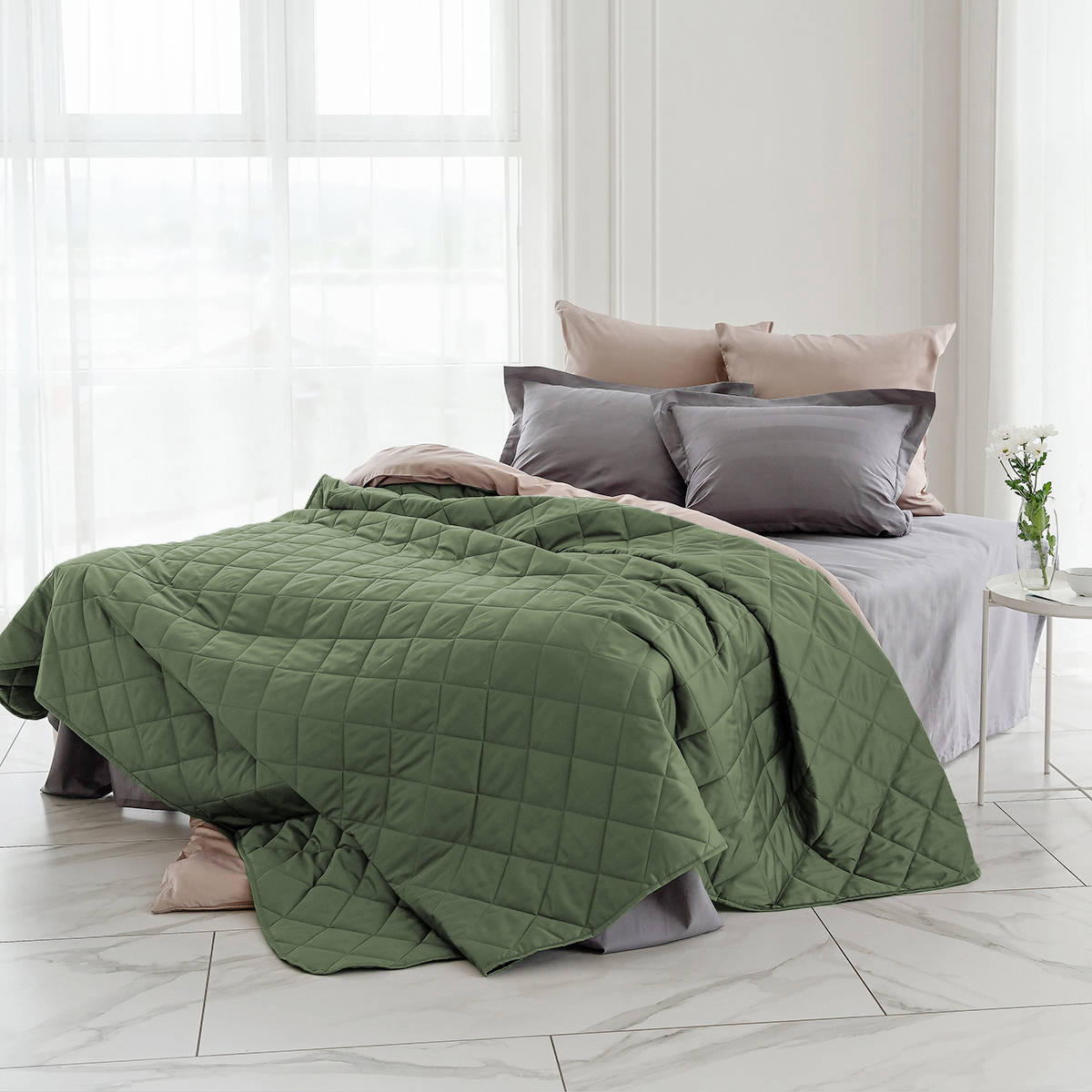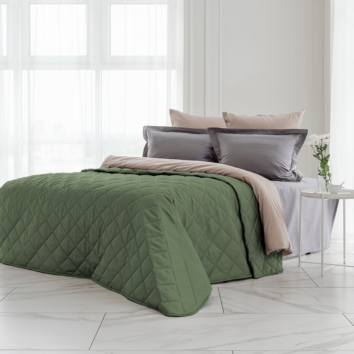 ОСОБЕННОСТЬ модели: хлопковое покрывало на кровать с закругленным уголком, практичной окантовкой по периметру изделия и стильной стежкой в виде ромбов.  Верхняя и нижняя часть покрывала выполнены из высококачественного египетского хлопка – безопасного, натурального и комфортного материала.