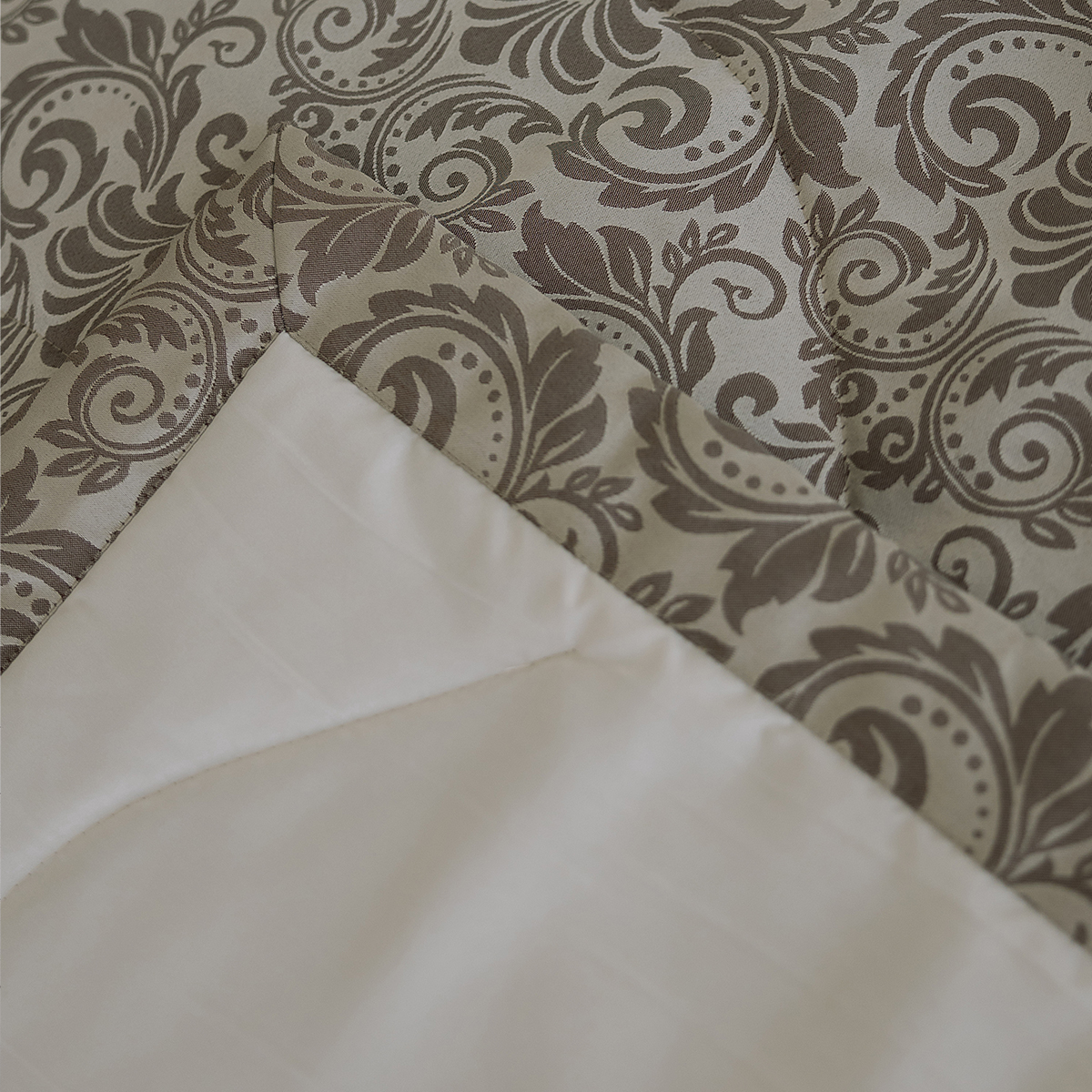 Состав: ткань портьерная 100% пэ, наполнитель - полиэфирное волокно. Стежка в виде волн. Подклад покрывала – микрофибра велюр, за счет своей фактуры он предотвращает скольжение покрывала на кровати.