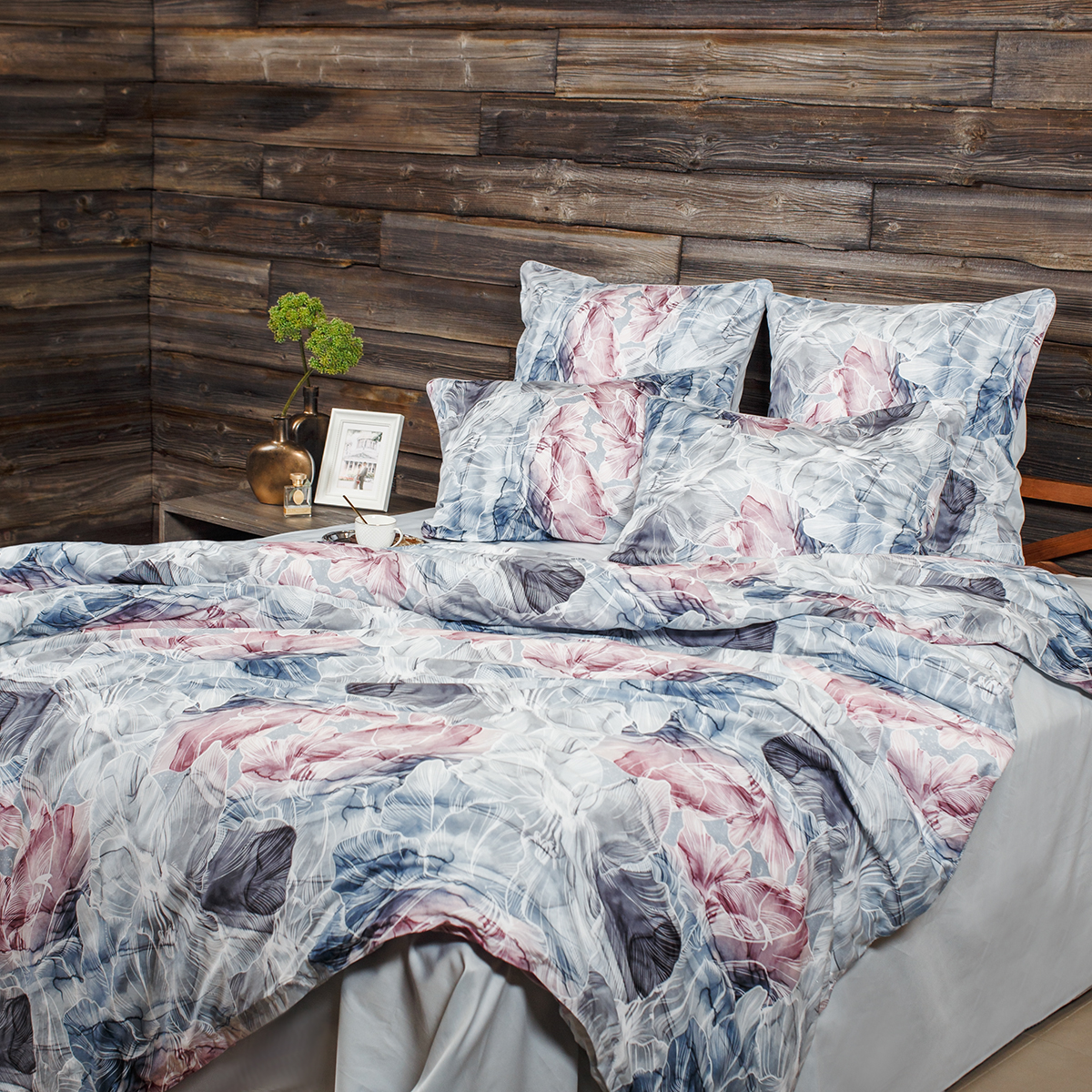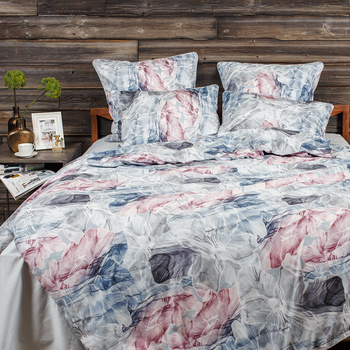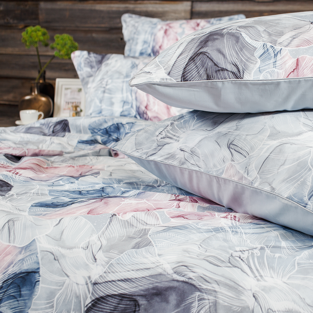 Изящный, будто воздушный, комплект воплощает в себе чарующую романтику, хрупкую красоту и элегантность. Нежное сочетание розово-голубых оттенков, стильно дополненное изящным и легким флористическим орнаментом, словно погружает нас в мир сказочных грез. Неповторимый стиль и гармония вашего интерьера.