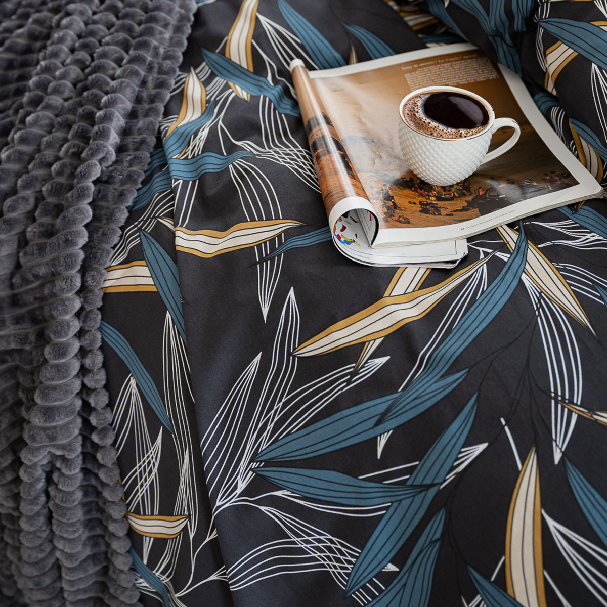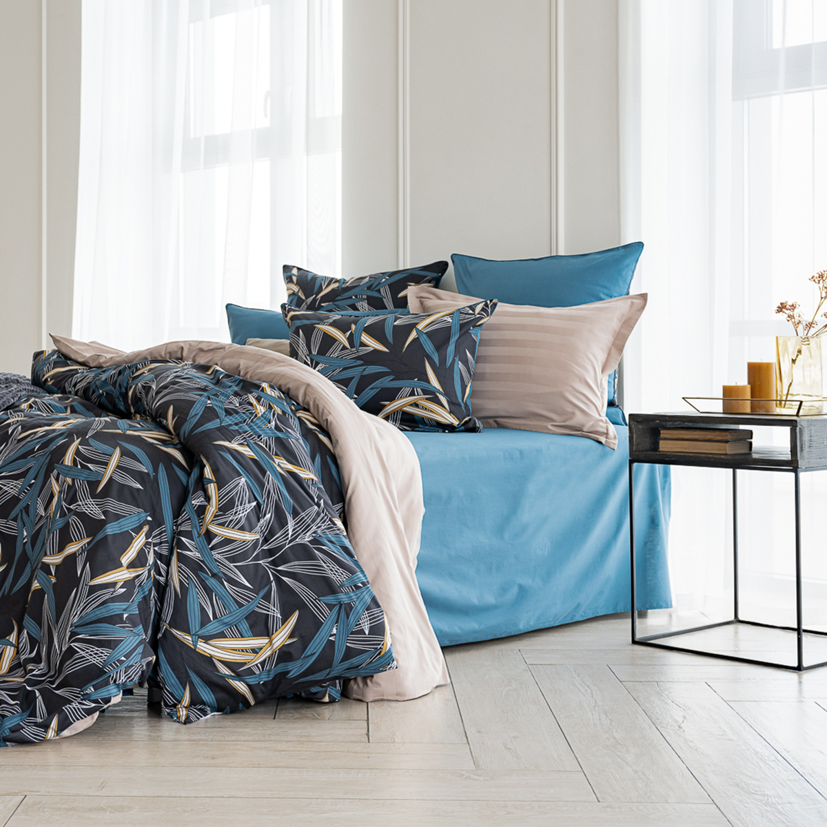 - Наволочки двухсторонние: лицевая сторона– растительный принт, оборотная – однотонная. Декоративный кант по трем сторонам наволочки.