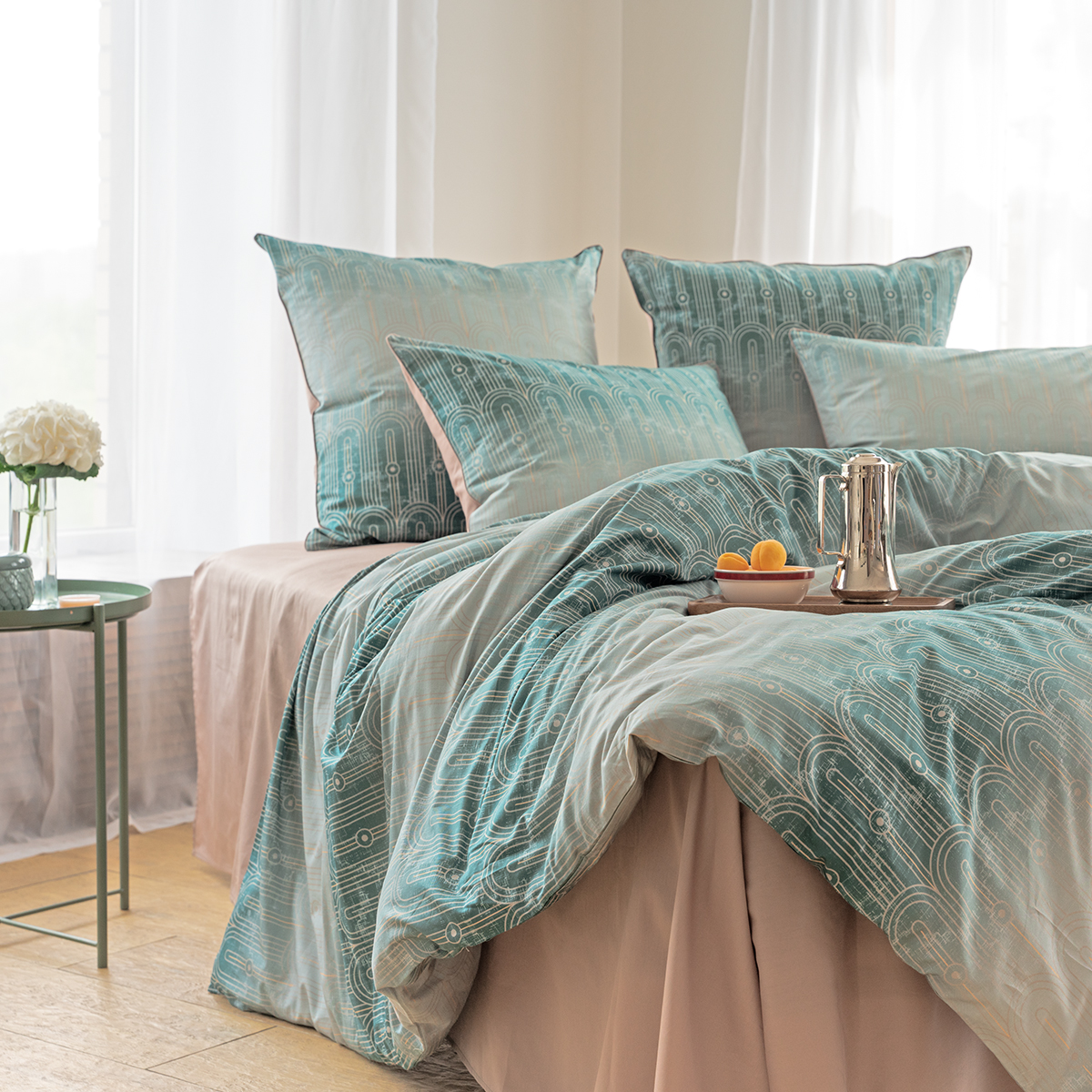 Постельное белье «Массимо» - чарующий градиент от глубокого нефритового оттенка до мягкого бежевого. Изящные линии орнамента напоминают стилизованную решетку итальянских палаццо.