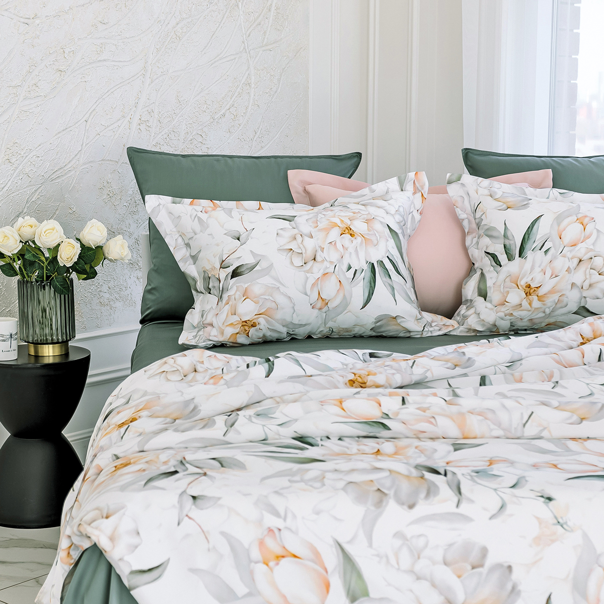 Мягкие переливы цвета пионов откроют в вашей спальне идеальные условия для комфортного сна и отдыха. Этот элегантный комплект сочетает в себе утонченность белого и естественность зелёного, наполняя пространство уютом и легкостью.