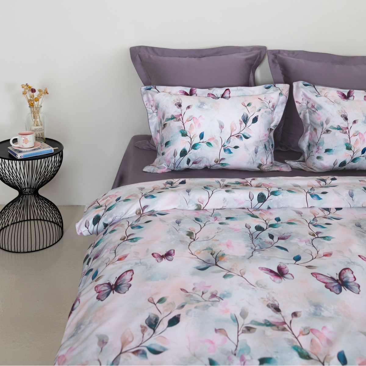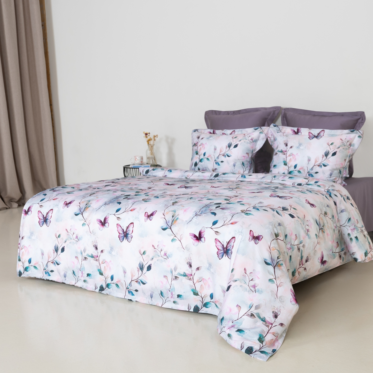 Очаровательный дизайн, вдохновленный природной нежностью, переносит в мир легкости и гармонии. Акварельные ветви с утонченными листьями и грациозные бабочки создают воздушную композицию, наполненную романтикой. Нежная пастельная палитра с плавными переходами оттенков подчеркивает изысканность и уют. Идеальный выбор для тех, кто мечтает о теплой и вдохновляющей атмосфере в спальне.