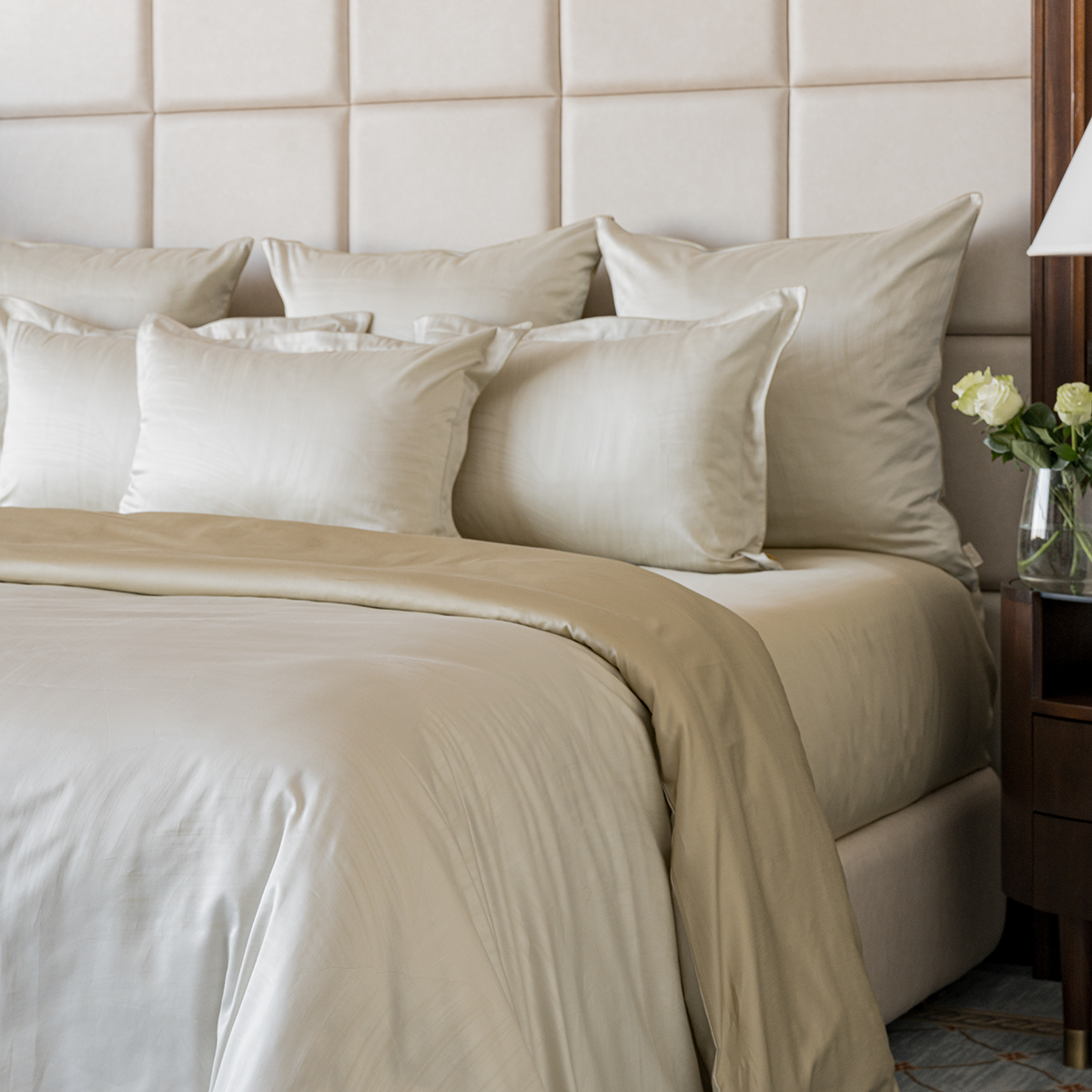 - Лицевая сторона наволочек и пододеяльника выполнена из жаккардовой ткани, оборотная из премиального длинноволокнистого хлопка сорта Пима