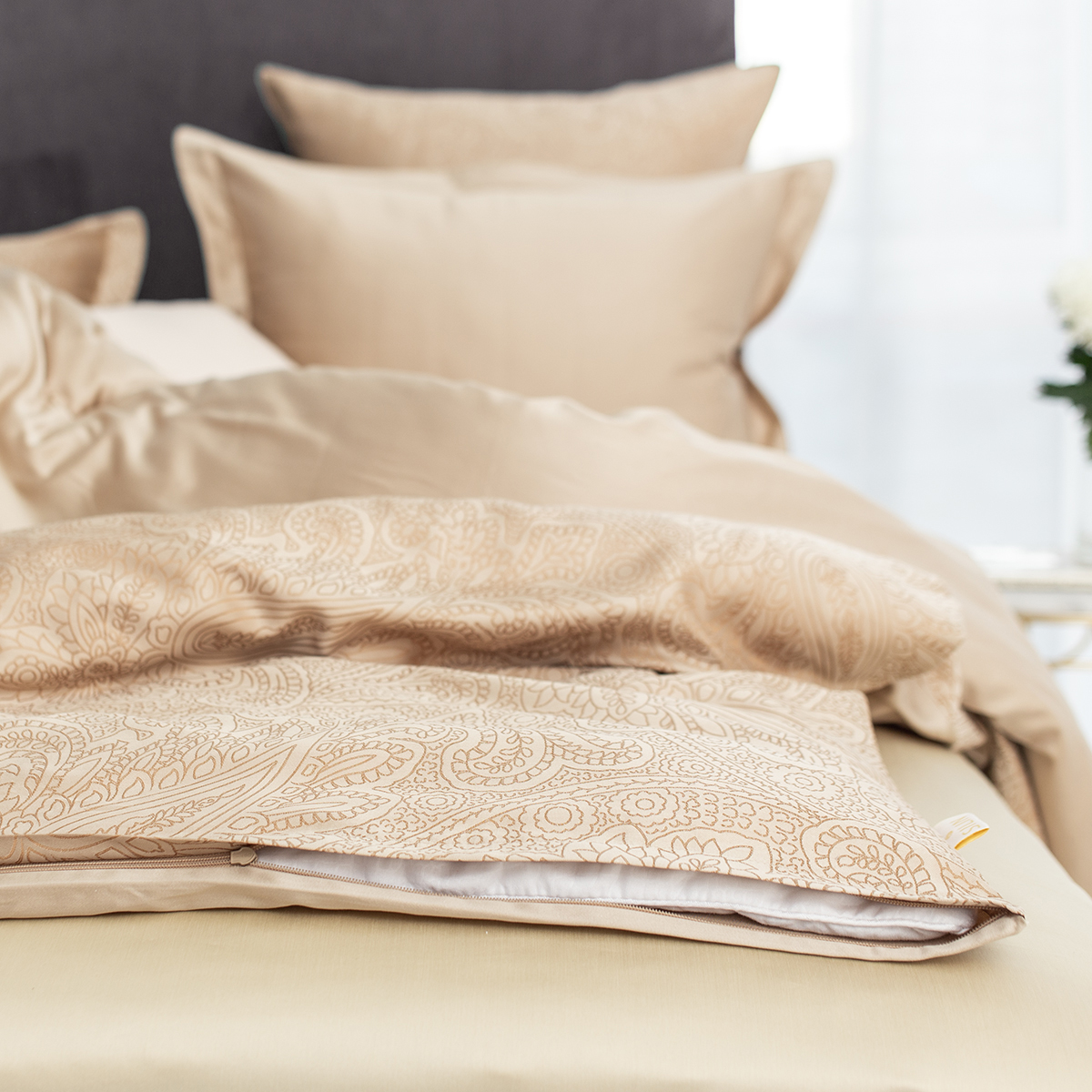 • Лицевая сторона наволочек и пододеяльника выполнена из жаккардовой ткани, оборотная из премиального длинноволокнистого хлопка сорта Пима